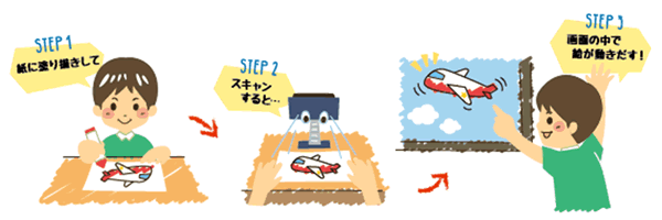 自分で描いた動物の塗り絵が画面の中で